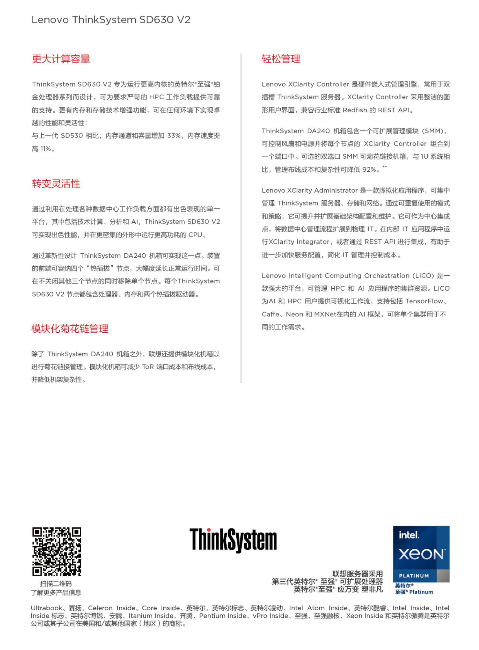 Lenovo ThinkSystemSD630 V2是一款专为工作负载设计的单一平台,可处理从云计算、分析到AI和计算机辅助工程(CAE)或电子设计自动化(EDA)等高性能计算应用。 ThinkSystem SD630 V2兼具刀片服务器的效率和密度以及机架服务器的价值和简易性,可交付经济高效的横向扩展平台,在最小的空间内交付更高的性能。
