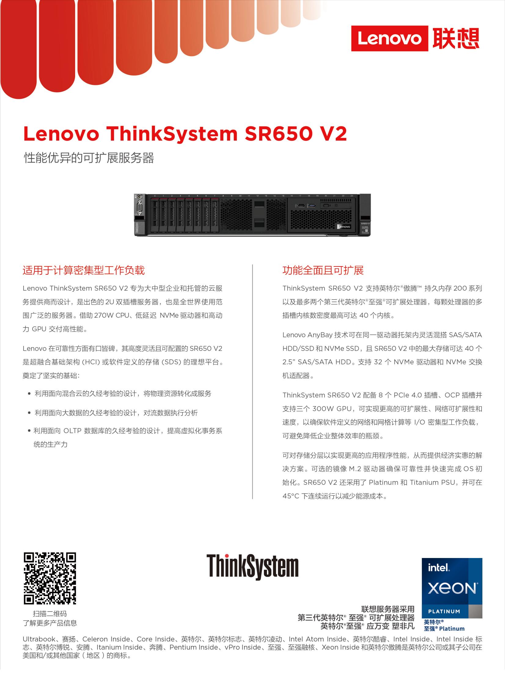 Lenovo ThinkSystem SR650 V2专为大中型企业和托管的云服务提供商而设计,是出色的2U双插槽服务器,也是全世界使用范围广泛的服务器。借助70WCPU、低延迟NVMe驱动器和高动力GPU交付高性能。