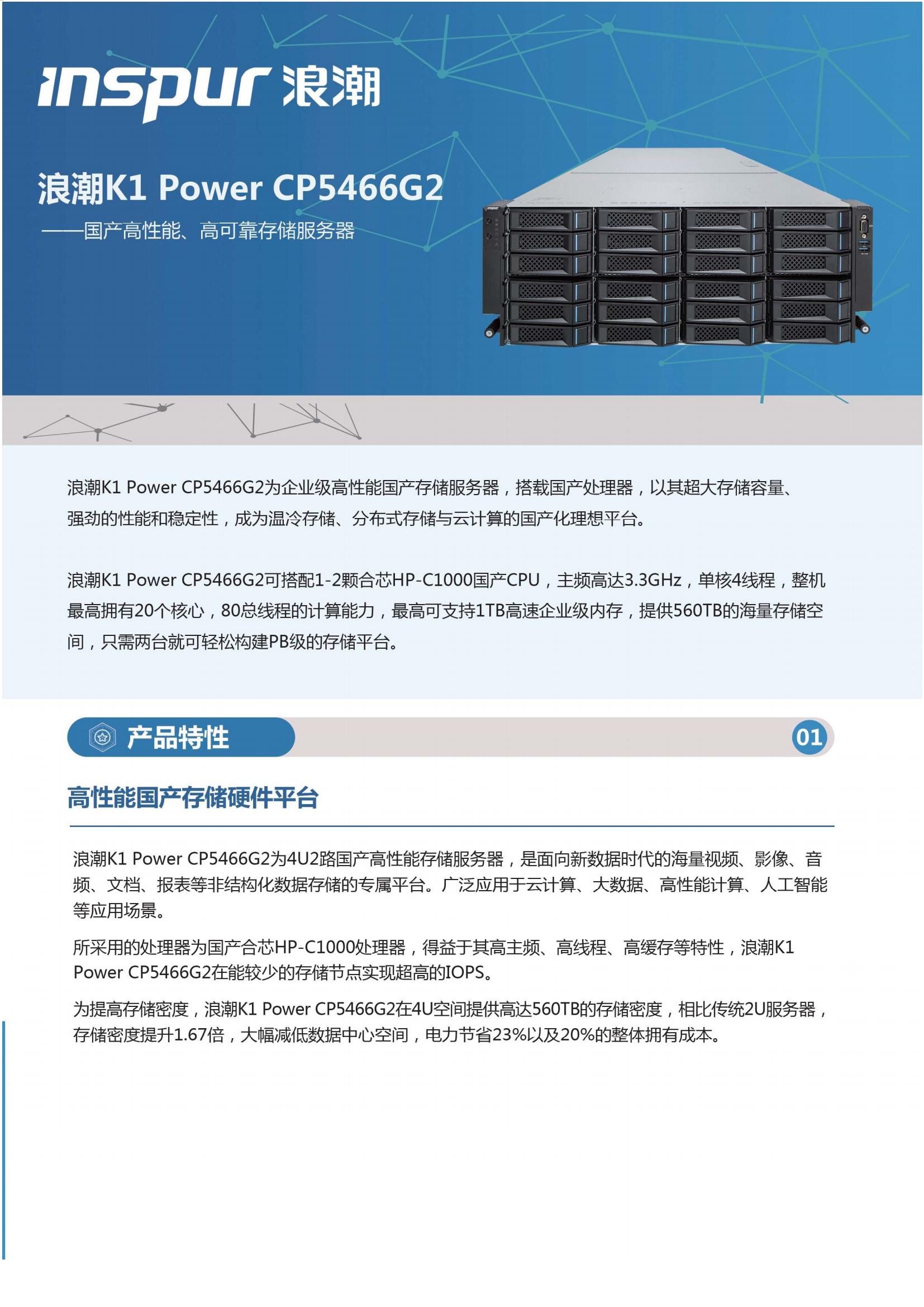 1. 浪潮K1 Power CP5466G2可搭配1-2颗合芯HP-C1000国产CPU,主频高达3.3GHz,单核4线程,整机最高拥有20个核心,80总线程的计算能力,最高可支持1TB高速企业级内存,提供560TB的海量存储空间,只需两台就可轻松构建PB级的存储平台。