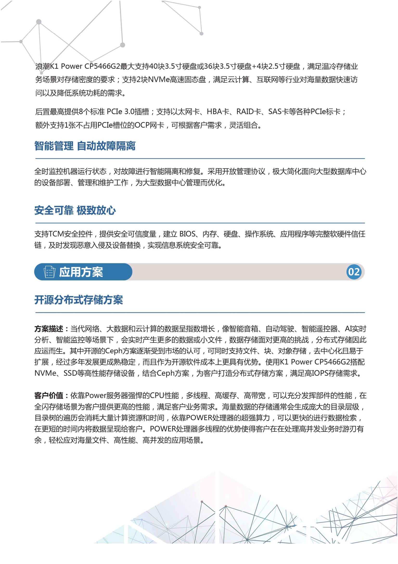2. 浪潮K1 Power CP5466G2为4U2路国产高性能存储服务器,是面向新数据时代的海量视频、影像、音频、文档、报表等非结构化数据存储的专属平台。广泛应用于云计算、大数据、高性能计算、人工智能等应用场景。