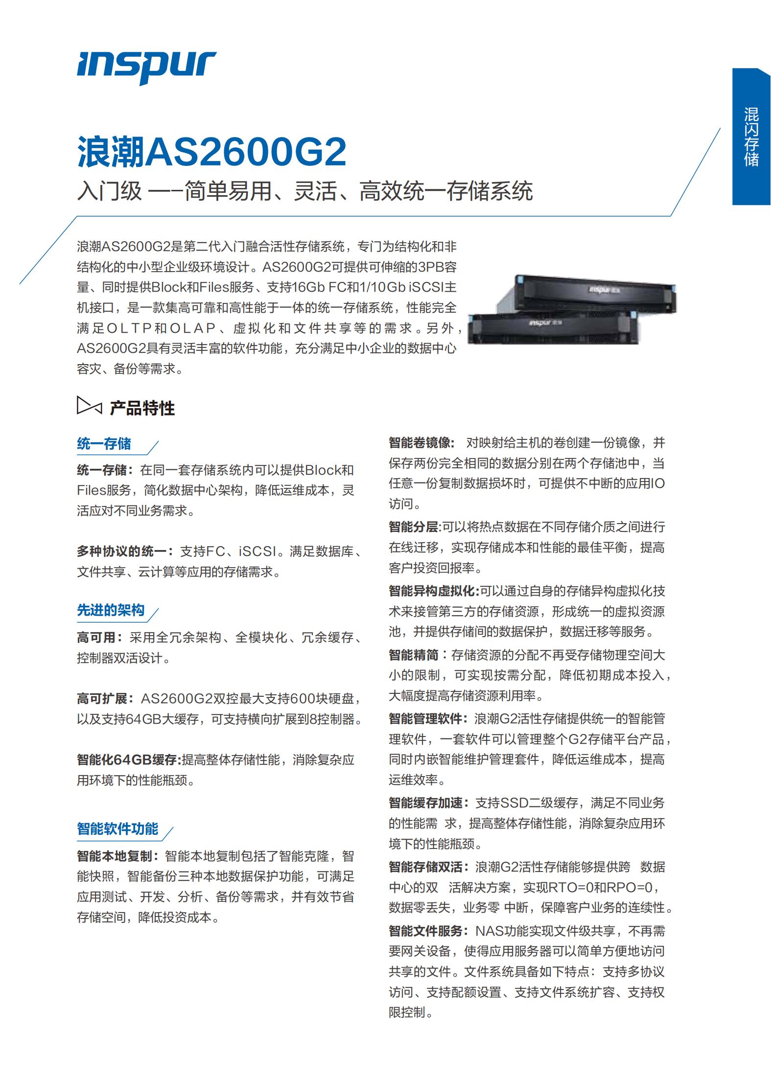 浪潮AS2600G2是第二代入门融合活性存储系统,专门为结构化和非结构化的中小型企业级环境设计。AS2600G2可提供可伸缩的3PB容量、同时提供Block和Files服务、支持16Gb FC和1/10Gb iSCSI主机接口,是一款集高可靠和高性能于一体的统一存储系统,性能完全满足OLTP和OLAP、虚拟化和文件共享等的需求 。另外,AS2600G2具有灵活丰富的软件功能,充分满足中小企业的数据中心容灾、备份等需求。