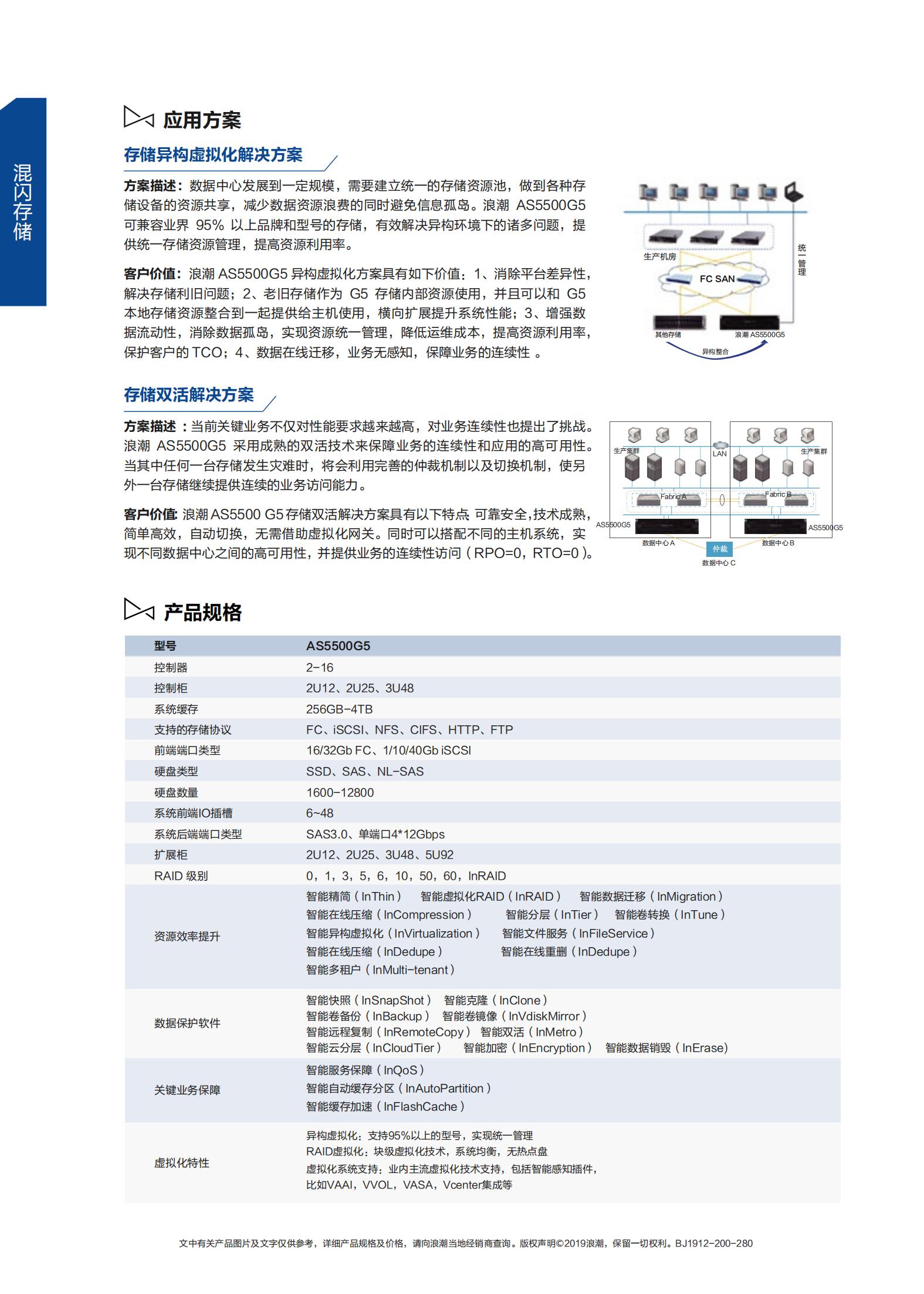 浪潮AS5500G5中端融合活性存储系统(以下简称G5中端活性存储)是一款定位于中大型企业,可同时提供SAN和NAS两种服务的统一存储系统。凭借专门为云计算,大数据环境打造的存储操作系统、丰富的软件功能以及业内领先的硬件平台等特性,很好的满足了大中型数据库OLTP/OLAP、虚拟化、文件共享等各种应用的数据存储、容灾等需求。同时浪潮专门研发了智能管理软件Inview,可轻松实现设备的统一管理、性能监控及双活、远程复制等容灾方案的轻松部署,大大简化运维工作。浪潮G5中端活性存储系统在性能、功能、可靠性和易用性上都达到了业界同档次产品中的最高水准,并广泛应用于政府、金融、通信、能源、媒资、医疗、教育、SMB等行业。