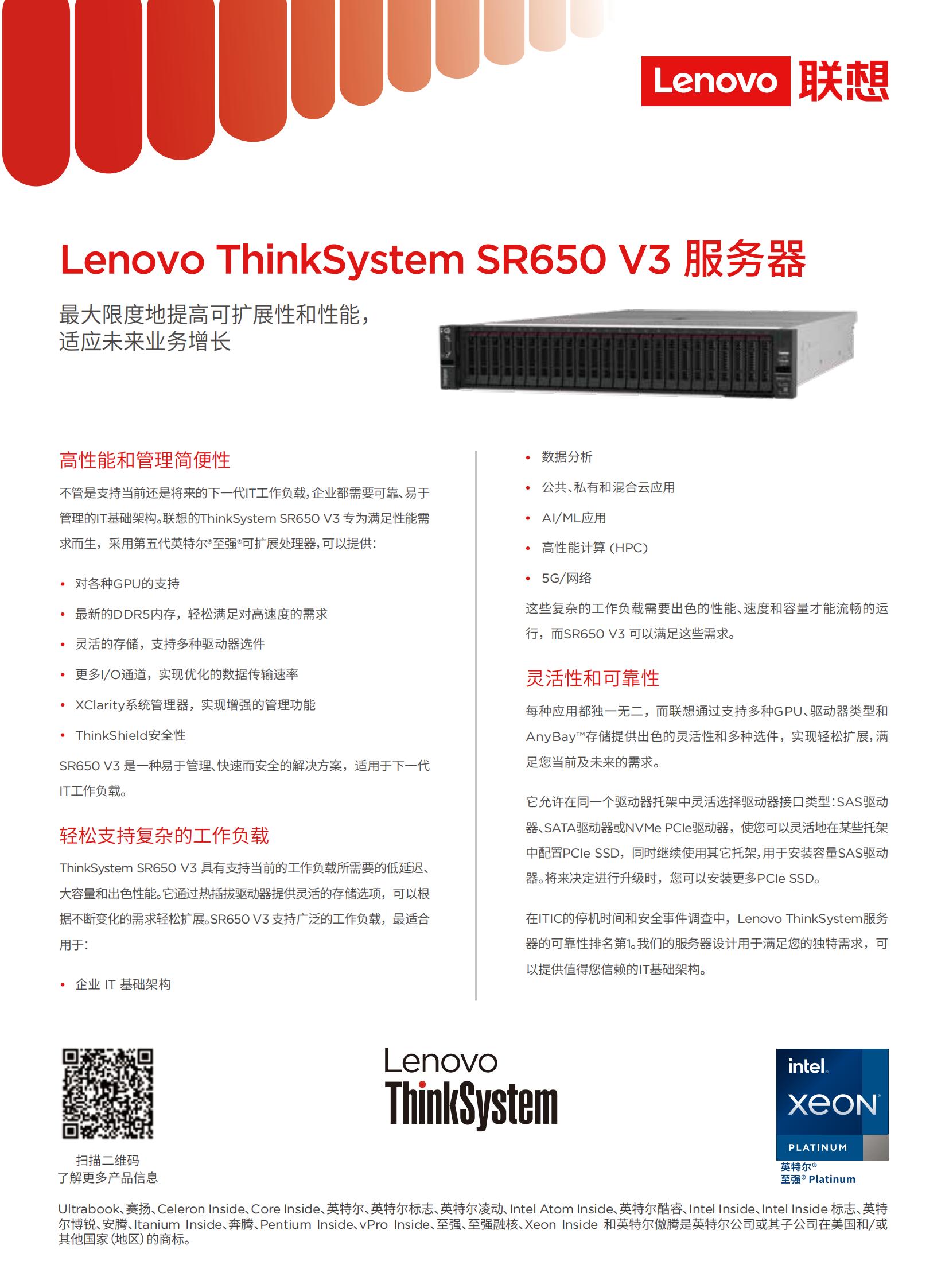ThinkSystem SR650 V3具有支持当前的工作负载所需要的低延迟、大容量和出色性能。它通过热插拔驱动器提供灵活的存储选项,可以根据不断变化的需求轻松扩展。