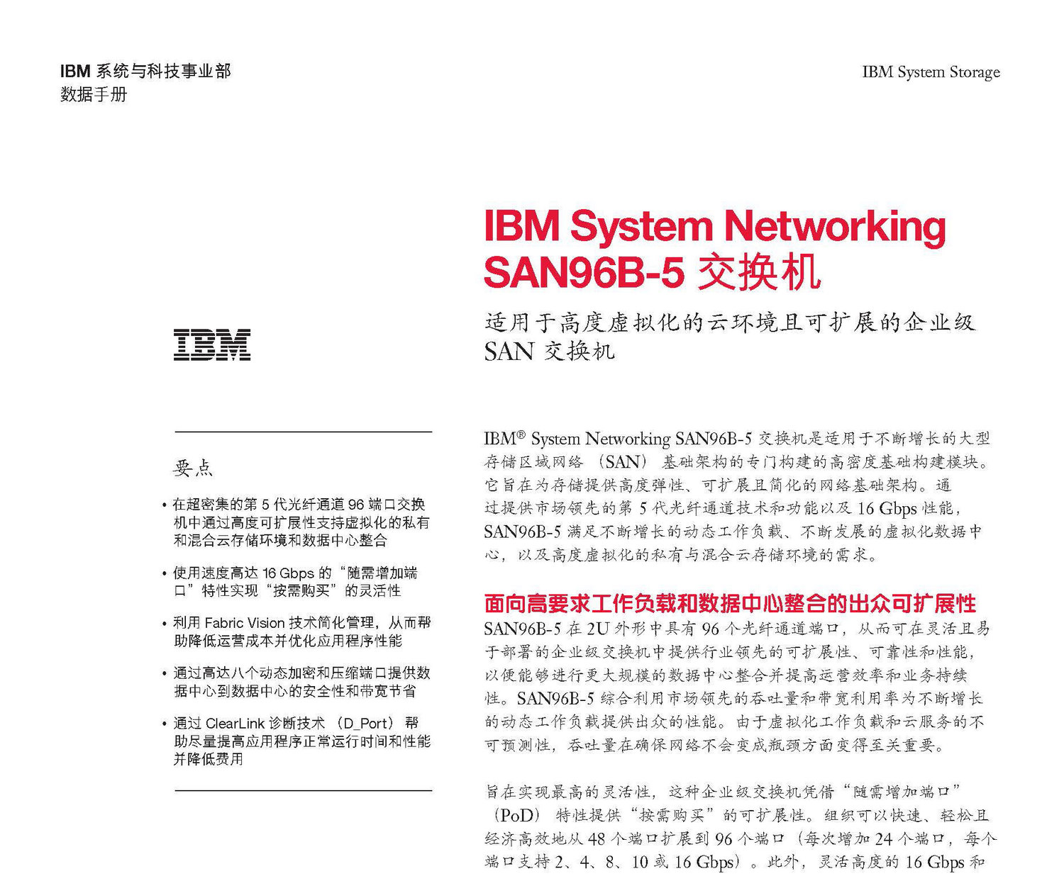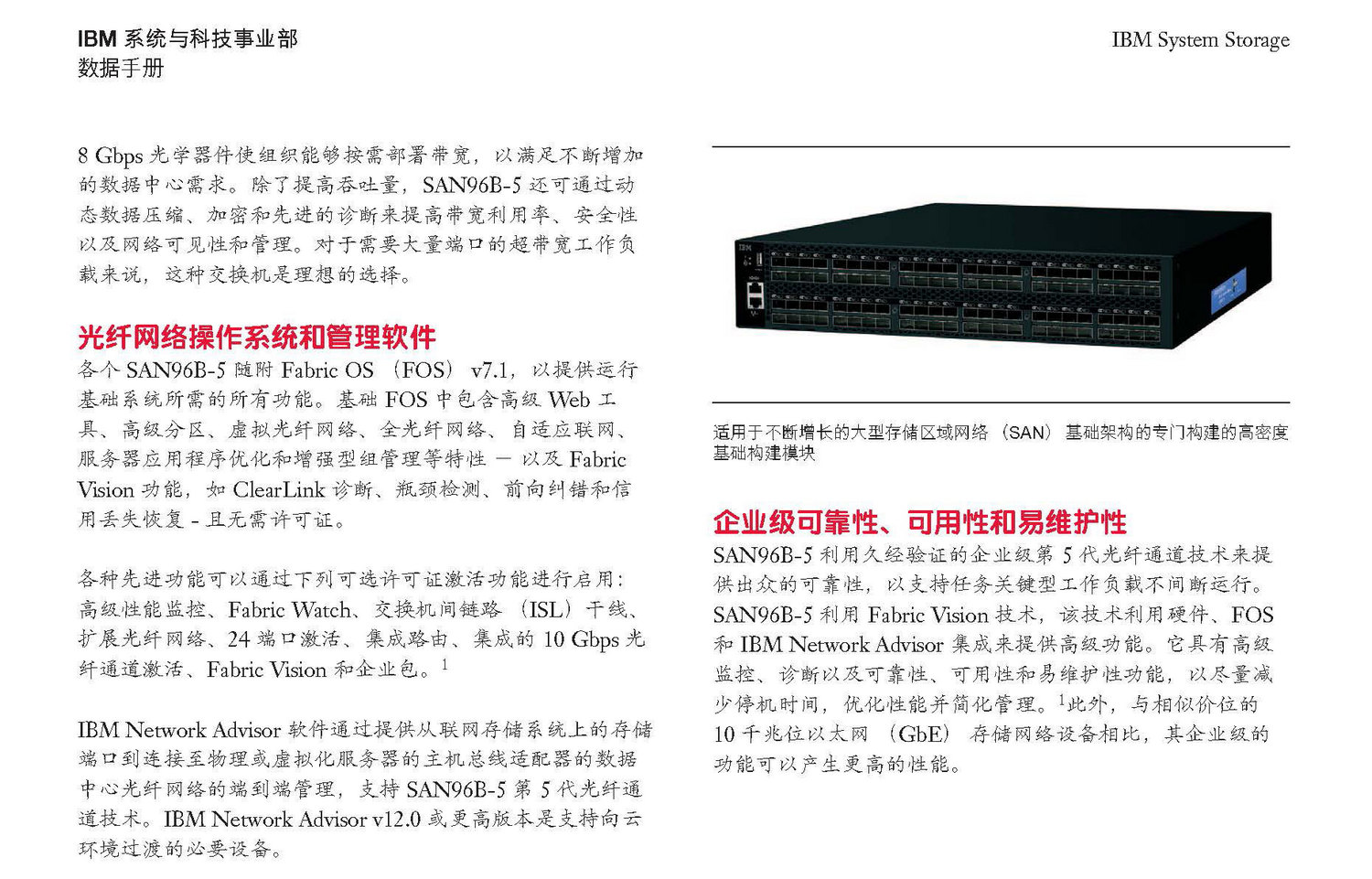 IBM® System Networking SAN96B-5 交换机是适用于不断增长的大型 存储区域网络 (SAN) 基础架构的专门构建的高密度基础构建模块。