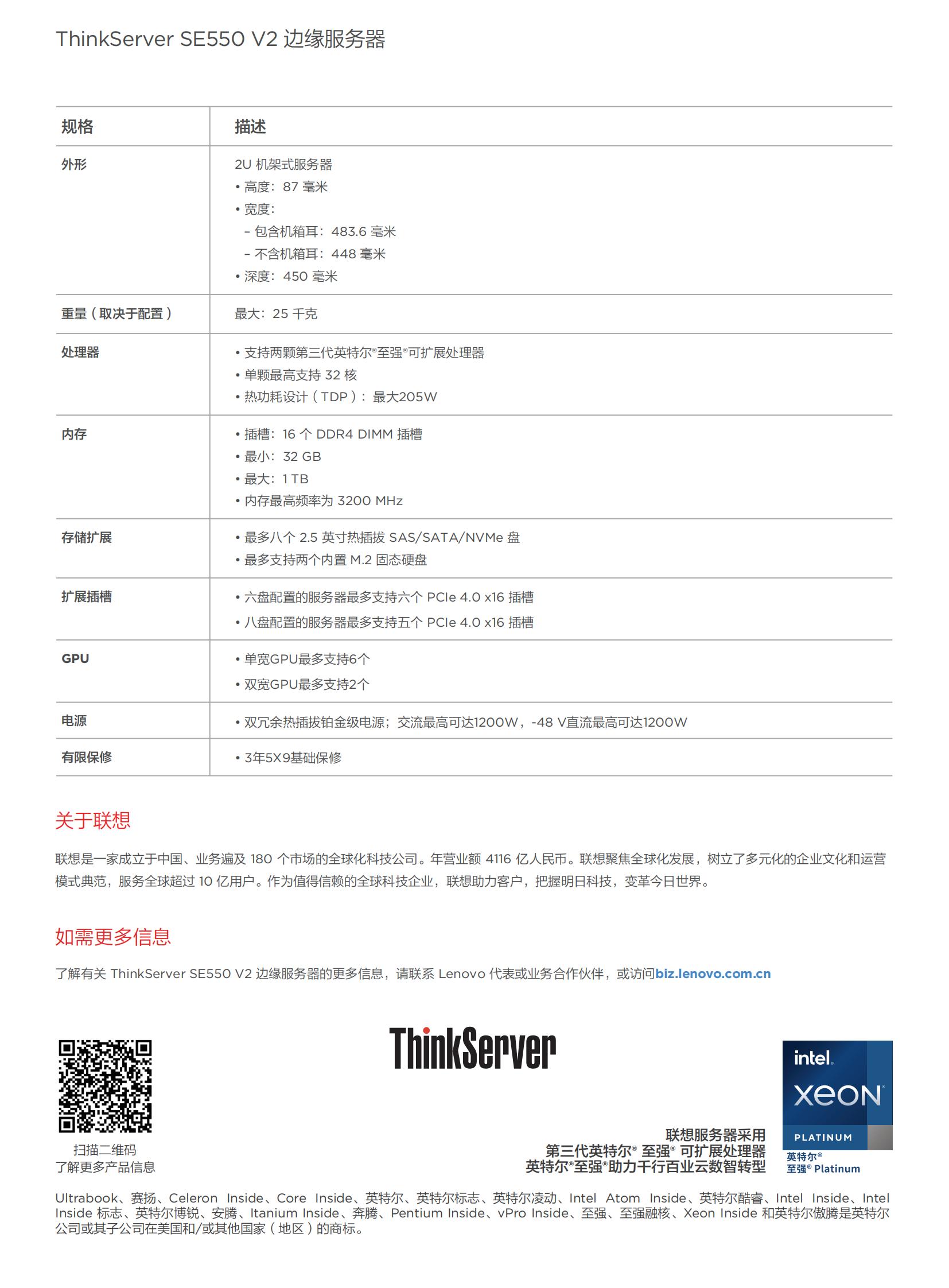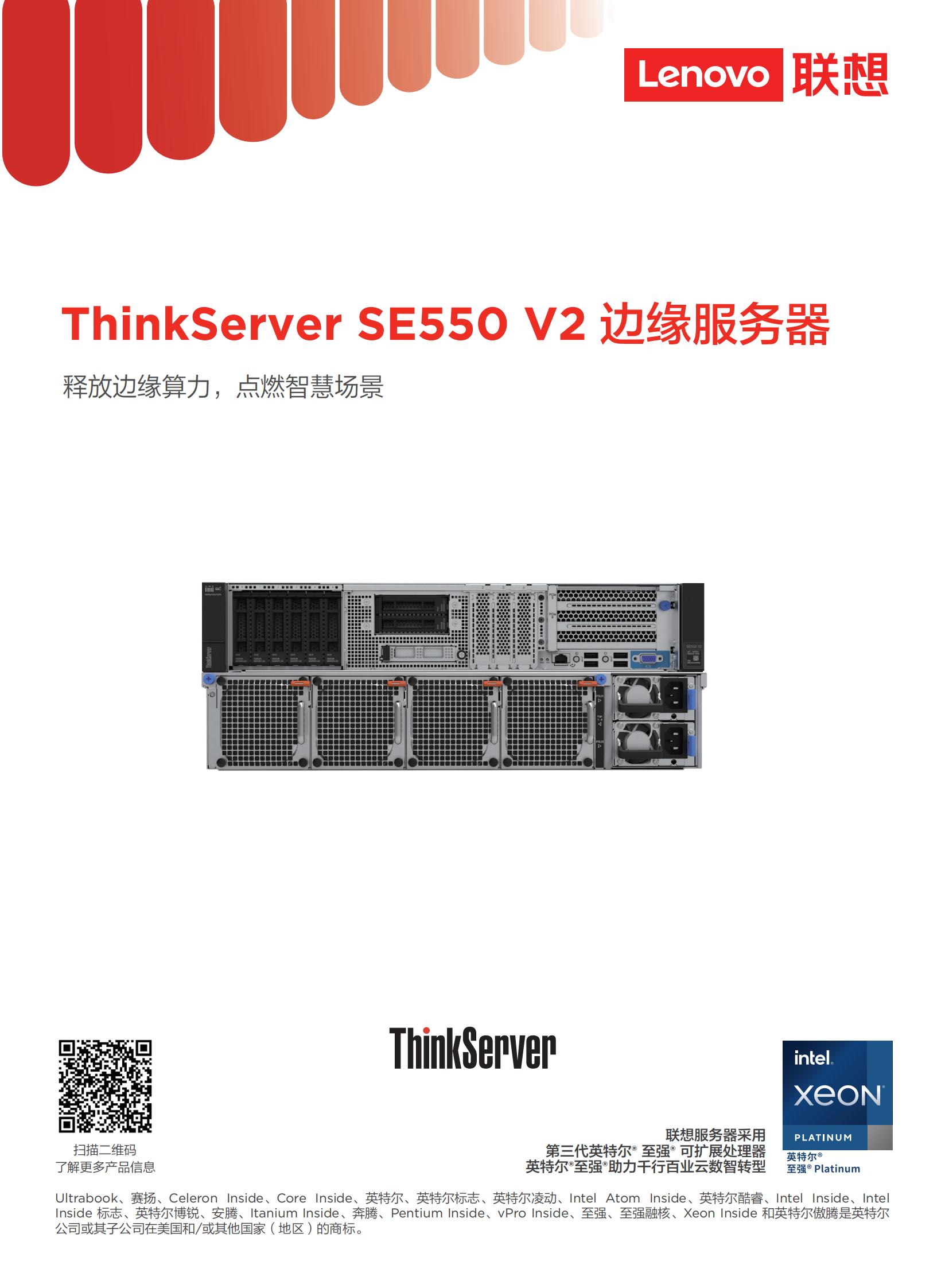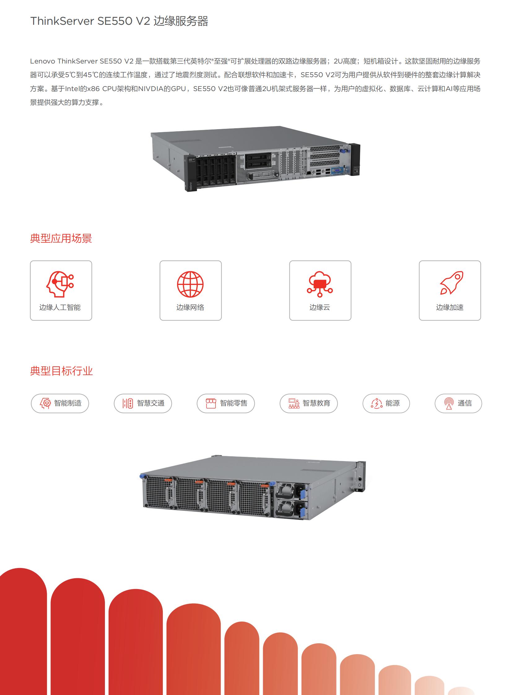 Lenovo ThinkServer SE550 V2 是一款搭载第三代英特尔至强®可扩展处理器的双路边缘服务器;2U高度;短机箱设计。这款坚固耐用的边缘服务器可以承受5℃到45℃的连续工作温度,通过了地震烈度测试。配合联想软件和加速卡,SE550 V2可为用户提供从软件到硬件的整套边缘计算解决方案。基于Intel的x86 CPU架构和NIVDIA的GPU,SE550 V2也可像普通2U机架式服务器一样,为用户的虚拟化、数据库、云计算和AI等应用场景提供强大的算力支撑。