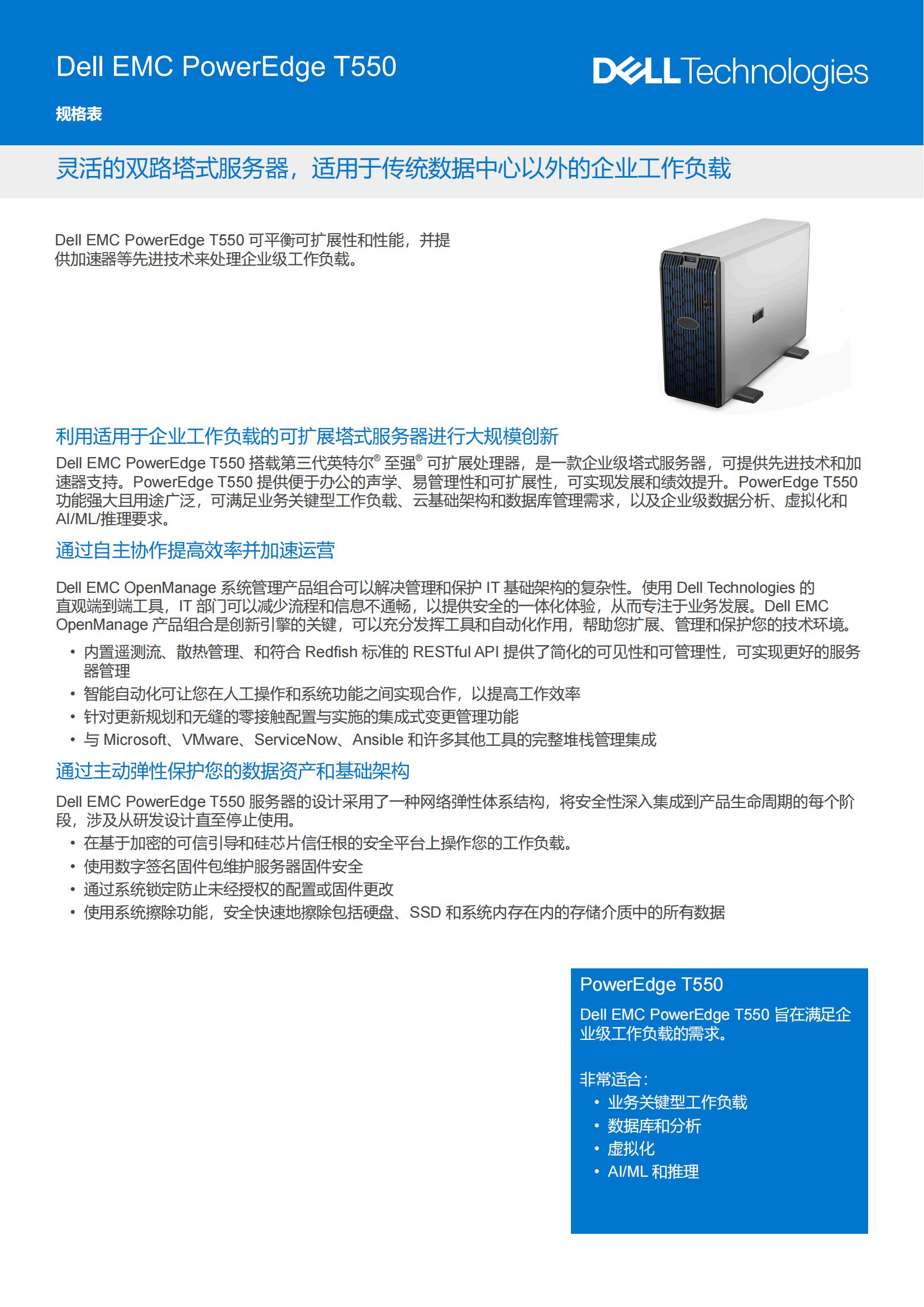 速器支持。PowerEdge T550 提供便于办公的声学、易管理性和可扩展性,可实现发展和绩效提升。PowerEdge T550