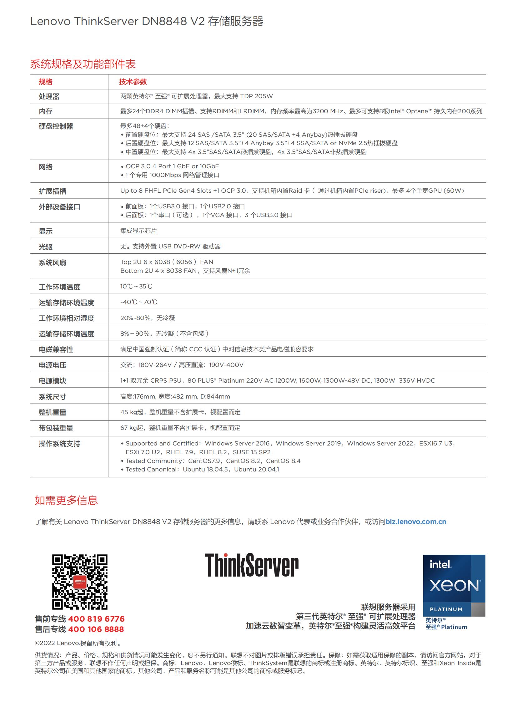 Lenovo ThinkServer DN8848 V2是基于第三代英特尔“至强" 可扩展处理器的4U 52盘位机架式存储服务器,支持48个3.5英寸热插拔驱动器位;