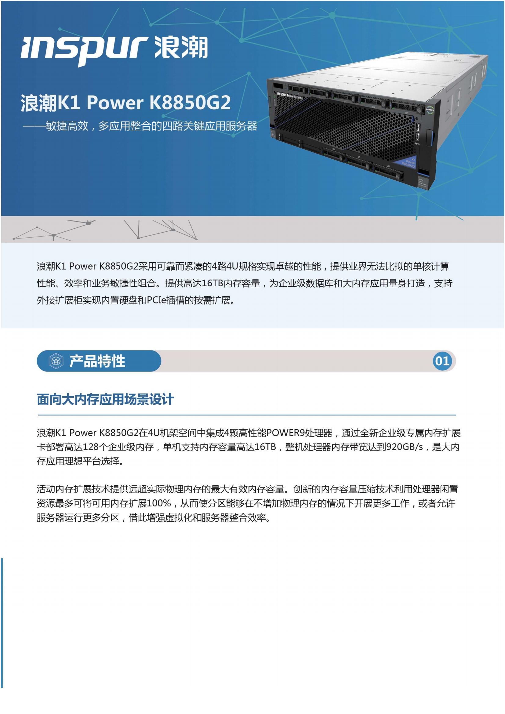 浪潮K1 Power K8850G2在4U机架空间中集成4颗高性能POWER9处理器,通过全新企业级专属内存扩展卡部署高达128个企业级内存,单机支持内存容量高达16TB,整机处理器内存带宽达到920GB/s,是大内存应用理想平台选择。